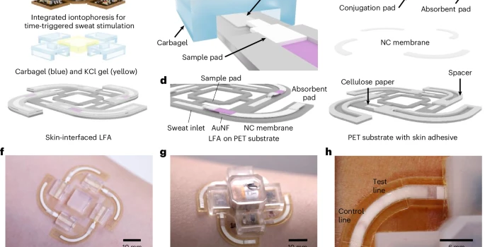 e, 侧流层析检测模块的分解示意图,展示其超亲水/超疏水观察窗、样品垫、结合垫、吸收垫、硝酸纤维素膜以及带有皮肤粘合剂的PET基底。