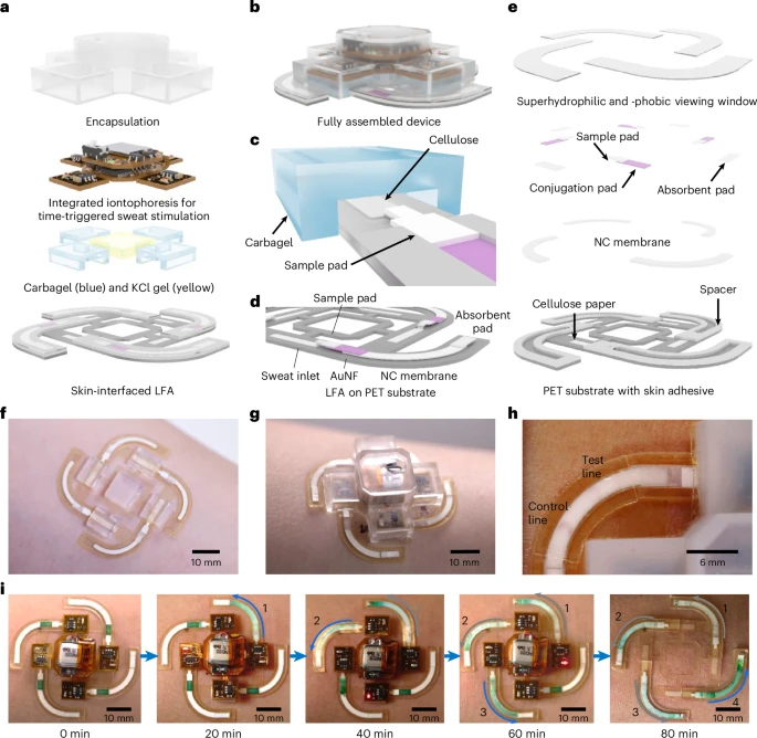 a, 装置分解示意图,包括封装盖、离子电渗刺激模块、含卡巴胆碱(蓝色)和氯化钾(黄色)的水凝胶,以及与皮肤接触的侧流层析检测模块。