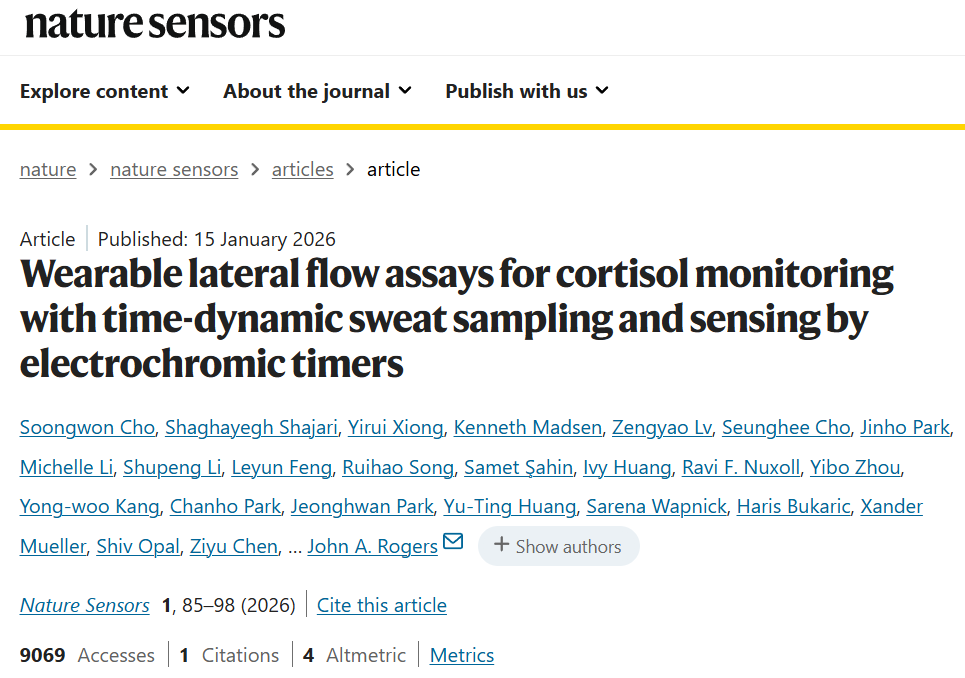 一套像“创可贴”一样贴在皮肤上的柔性微流控芯片,不仅无需电池就能定时采集汗液样本,还能像家用验孕棒一样,通过肉眼可见的颜色变化,实现对关键压力激素——皮质醇的持续、精准监测。这一由美国西北大学John A. Rogers团队领导的研究,于2026年1月15日发表于《自然·传感器》期刊,将侧向层析技术(LFA)与创新的“被动式”计时、采样机制相结合,有望彻底改变从慢性压力管理到睡眠障碍治疗的个人化健康监测方式。