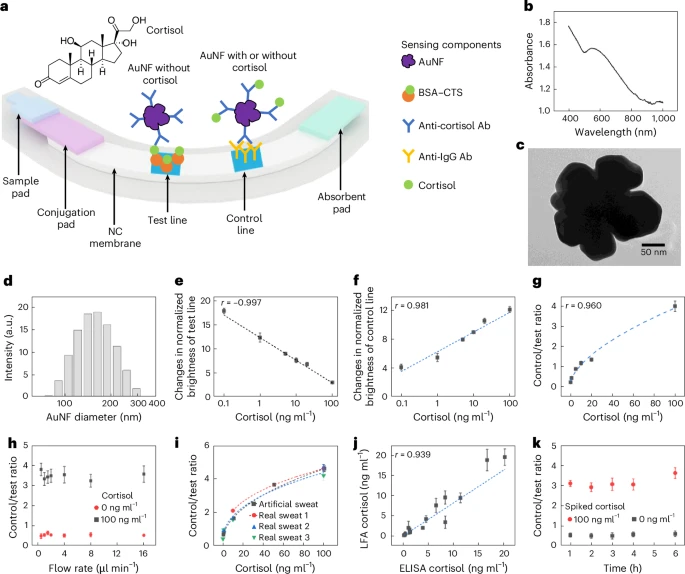 图2:采用AuNFs用于汗液皮质醇传感的侧流层析平台之合成、机制与表征结果。