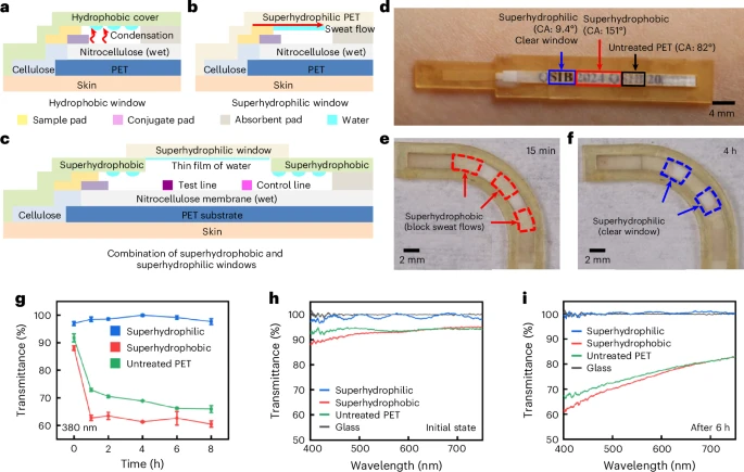 c,侧流层析检测装置组装体的截面图,其观察窗由超疏水与超亲水材料组合构成。该结构可防止检测线上方和质控线下方的蒸汽凝结,并阻挡汗液穿过观察窗。