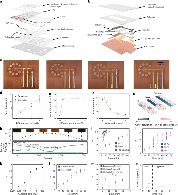 n,在两位受试者身上对完全集成装置的实际演示,包括离子电渗诱导出汗及后续运动。n = 1。数据表示为平均值 ± 标准差(对于图表d–g及i–m,n=3次技术重复)。
