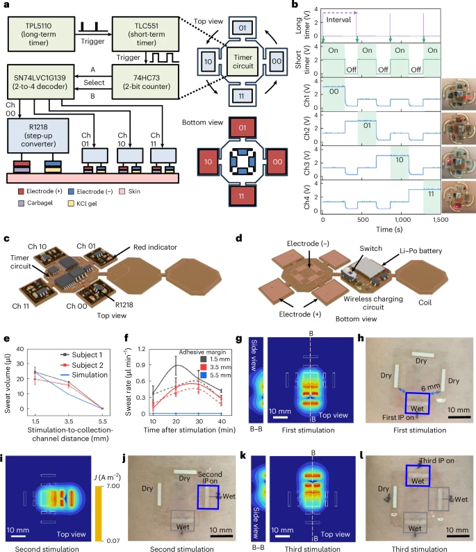 图3:用于汗液刺激的离子电渗电子装置之时序操作机制及表征结果。