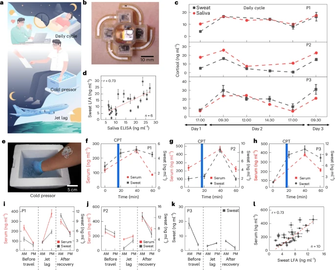 对多名受试者进行连续多日的监测,成功捕捉到皮质醇典型的昼夜波动模式——清晨浓度最高,随后逐渐下降,傍晚最低。其测得的数据与同步采集的唾液皮质醇浓度变化高度同步(r = 0.73),首次系统性地证明了汗液在监测皮质醇昼夜节律上的可行性。