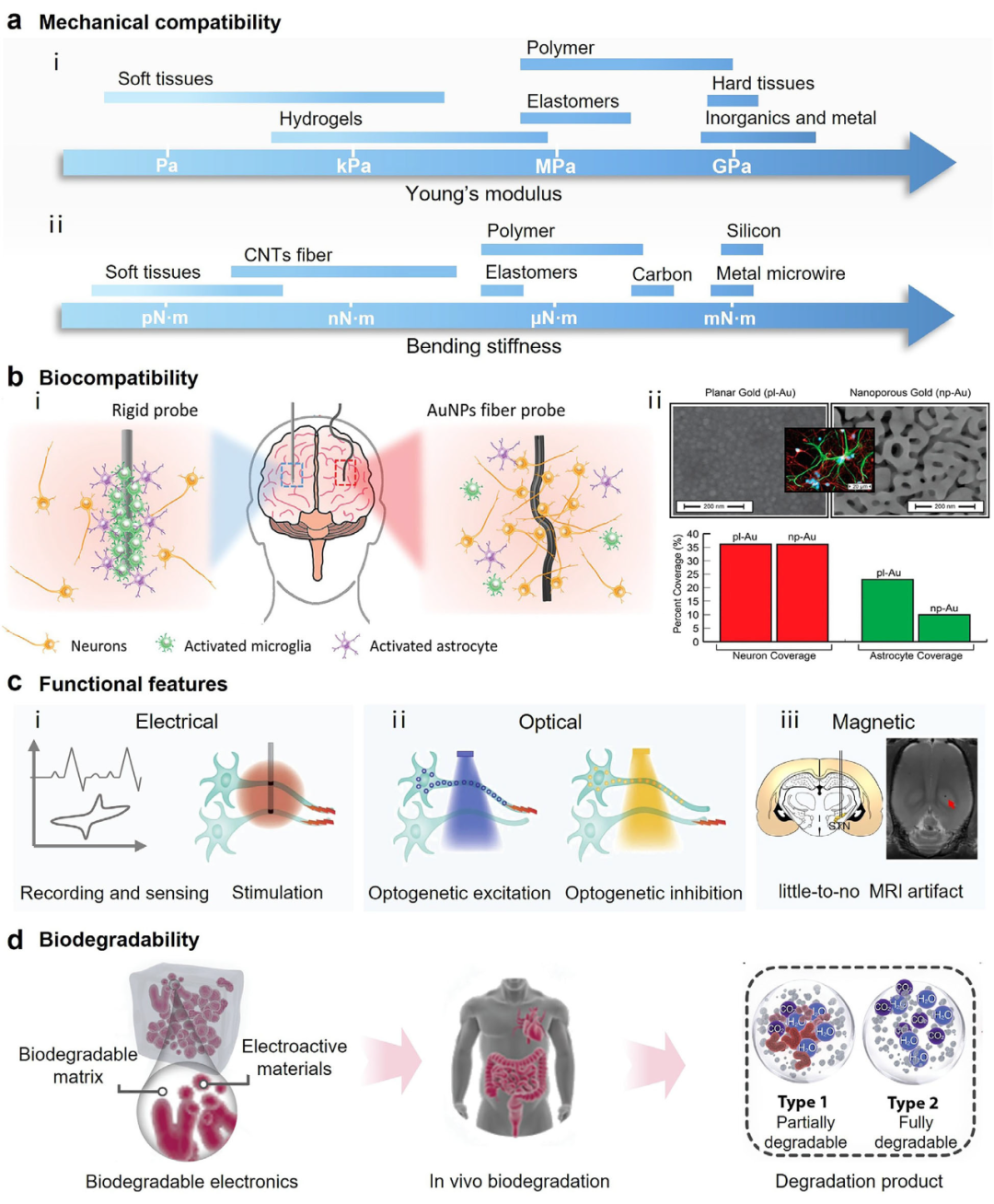 图片说明:该图系统地总结了设计高性能纤维探针必须考虑的四大要素。a) 机械兼容性:探针的杨氏模量和弯曲刚度需与软组织匹配。b) 生物相容性:通过表面修饰等手段减少异物反应。c) 多功能性:集成电、光、磁等多种功能。d) 生物可降解性:实现探针在体内的安全降解。