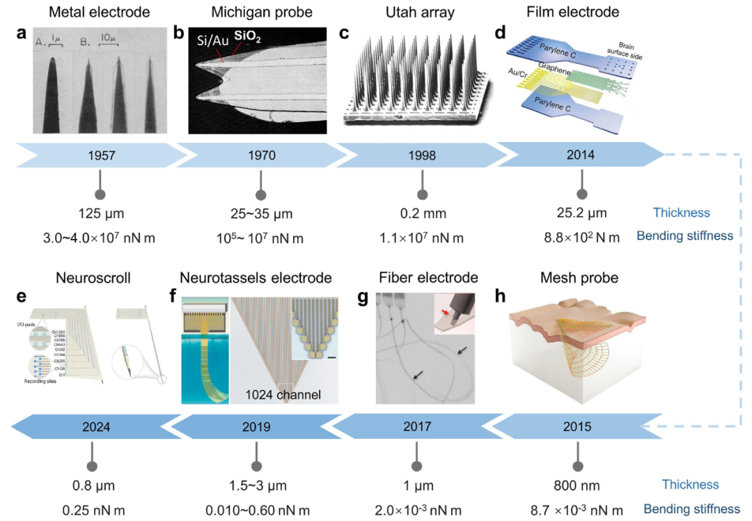 图片说明:该图清晰地展示了植入式探针从早期坚硬的金属电极(a)、硅基密歇根探针(b)和犹他阵列(c),逐步向柔性的薄膜电极(d)和超柔性的网状/纤维状探针(e-h)演进的历史。可以看到,探针的厚度和弯曲刚度在数十年间降低了数百万倍,充分说明了“柔性化”是该领域不可逆转的趋势。