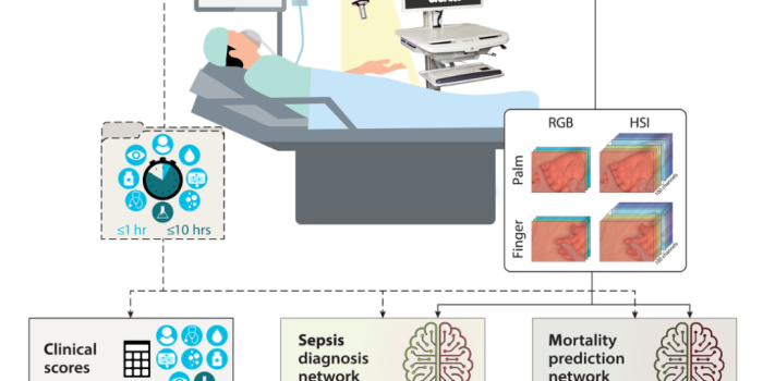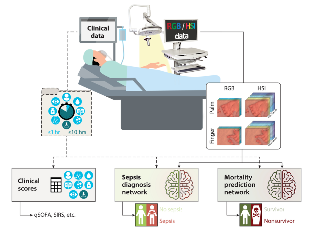由于脓毒症仍然是死亡的主要原因,早期识别脓毒症患者和死亡高危人群是一项具有高度社会经济意义的挑战。鉴于高光谱成像 (HSI) 监测微循环改变的潜力,该研究提出了一种深度学习方法,使用在几秒钟内获取的单个 HSI 立方体来自动诊断和死亡率预测。在一项前瞻性观察性研究中,从 480 多名重症监护病房患者的手掌和手指收集了 HSI 数据。应用于 HSI 测量的神经网络预测败血症和死亡率,受试者工作特征曲线下面积 (AUROC) 分别为 0.80 和 0.72。随着临床数据的增加,表现显着改善,脓毒症的 AUROC 达到 0.94,死亡率达到 0.83。基于深度学习的 HSI 分析能够快速、无创地预测脓毒症和死亡率,对加强诊断和治疗具有潜在的临床价值。