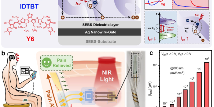 图片说明:该图全面展示了本研究的设计理念。b图描绘了体外近红外光如何激活植入皮下的柔性光电晶体管控制器,从而产生高频电流,阻断由肢体末端向上传递的疼痛信号。a图则揭示了其核心光电晶体管的材料与结构设计,特别是IDTBT /Y6异质结的运用。(改编自论文图1)