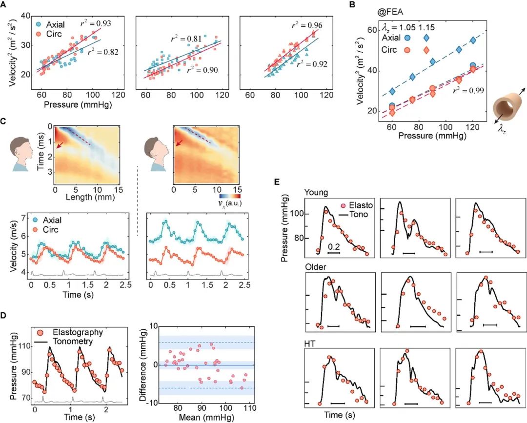 研究团队首先将目光投向了血压表征,并揭示出波速与血压之间的线性关系(图3A-B),这为连续、无创测量血压提供了新思路。相比轴向导波速度,环向导波速度在预测血压时表现出更强的稳定性和鲁棒性。研究团队设计了一个对比实验,让志愿者分别在正常坐姿和仰头伸颈的姿势下接受超声测试。结果发现,颈部伸展会明显提升轴向导波速度(提升约17%),但对环向导波速度几乎没有影响(图3C),这意味着环向波速不受颈部姿势变化的干扰,因此能更准确反映真实血压。此外,通过与非侵入式连续血压测量的金标准——压平法进行对比,导波法展示出良好的一致性,其能够较准确地测量出不同组别的血压波形及绝对幅值(图3D-E)。