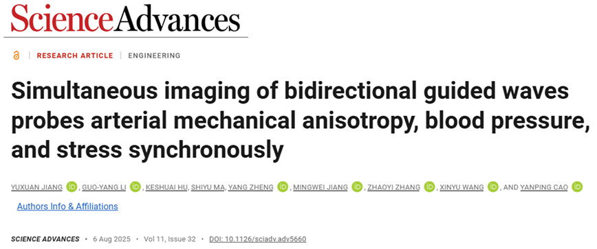 近日,清华大学、北京大学和北医三院团队联合研发出一种血管在体力学成像的超声新技术,仅用时4毫秒,即可在同一位置同时测量到动脉刚度、应力、及局部血压的信息,为心血管疾病的早期诊断、个体化评估与病程监测提供了新工具。相关文章已于近期发表于《Science Advances》杂志,题为“Simultaneous imaging of bidirectional guided waves probes arterial mechanical anisotropy, blood pressure, and stress synchronously”。