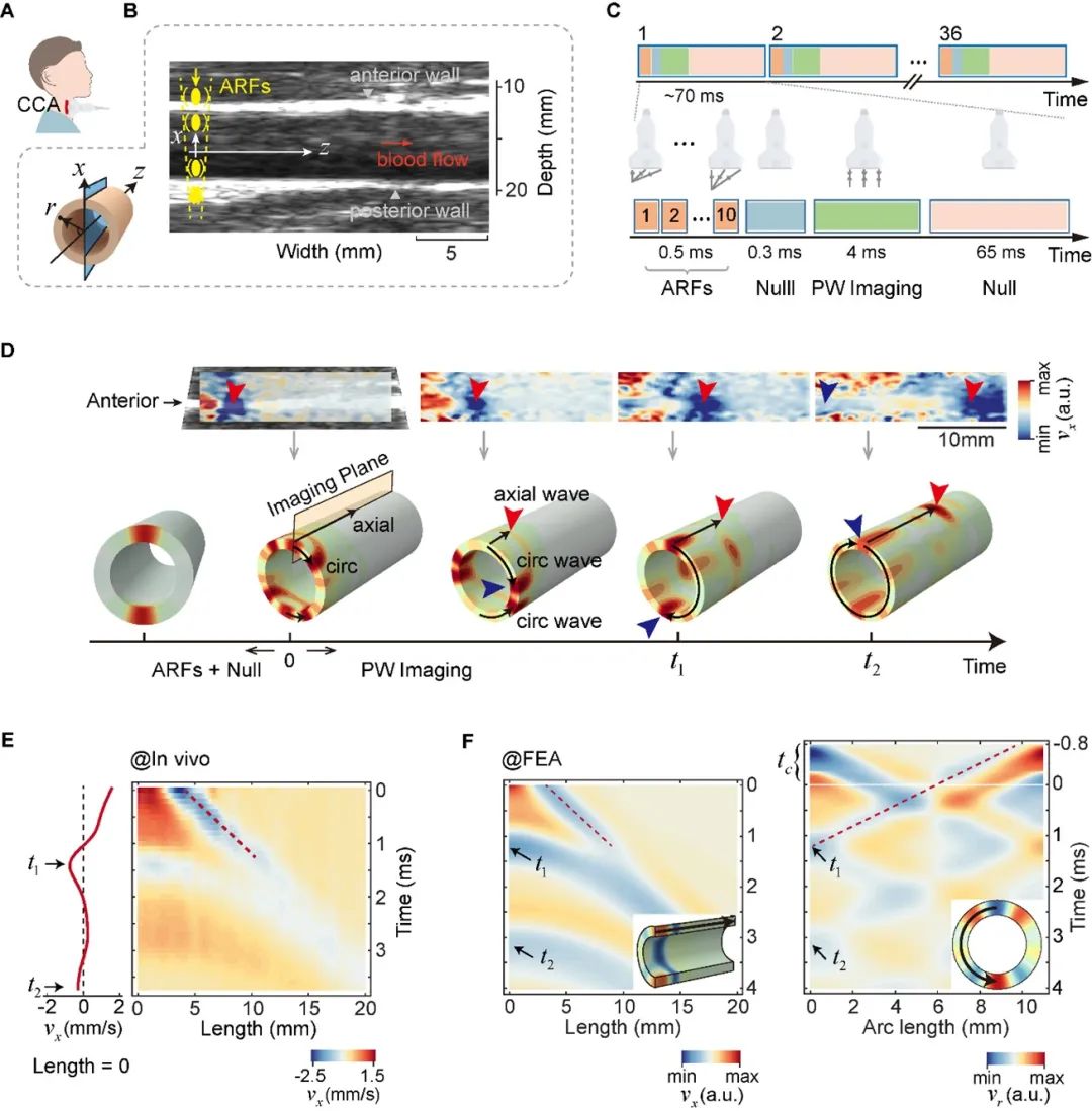 聚焦声辐射力就像“虚拟的指尖”,能够在人体内部无接触地“轻拍”血管,激发出弹性波。利用高速超声成像技术,研究人员可以实时捕捉这些弹性波的运动轨迹,并用于解读血管的力学状态。这一套流程可总结为:激励波动、快速成像、力学分析。研究团队设计了一种“编程”声辐射力,可以同时作用在血管的上下壁,激发出沿血管轴向和环向传播的两种弹性导波(图1A-B)。实验中,研究人员首次在纵向切面超声图像中清晰捕捉到了这两种波的传播特征(图1D-E)。基于上述的激励和成像设计,研究团队实现了一次成像,就能同时获取两个方向的弹性波信息。