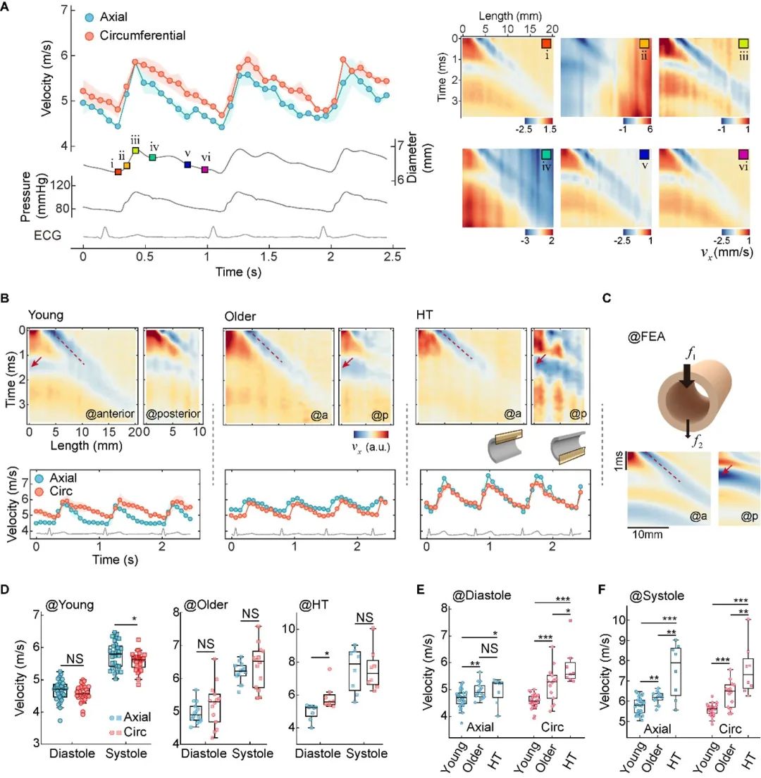 得益于单次超声成像仅约4毫秒的超快速度,研究团队设计出一套由多次“激励+采集”组成的连续成像序列,总耗时约2.5秒(图1C),从而完整记录了双向导波在多个心动周期内的动态变化。实验招募了年轻组、中老年正常血压组和中老年高血压组志愿者,测试其右侧颈总动脉。实验清晰观察到双向导波速度随动脉直径和血压的同步变化波动(图2A),揭示出导波速度和动脉刚度、血压等的强相关性。组间对比表明,随年龄增加,双向导波速度整体升高;高血压患者的环向导波速度相比轴向波速明显升高(图2E-F),提示动脉壁在病理状态下出现各向异性的结构重塑。有趣的是,统计结果显示两个方向的波速无显著差异(图2D),这一现象与动脉各向异性的刚度特征并不一致;因此,仅通过双向波速难以为临床提供确切的生物力学参考,还需结合上述波场信息,对血压、刚度和应力等关键力学指标进行进一步的定量表征。