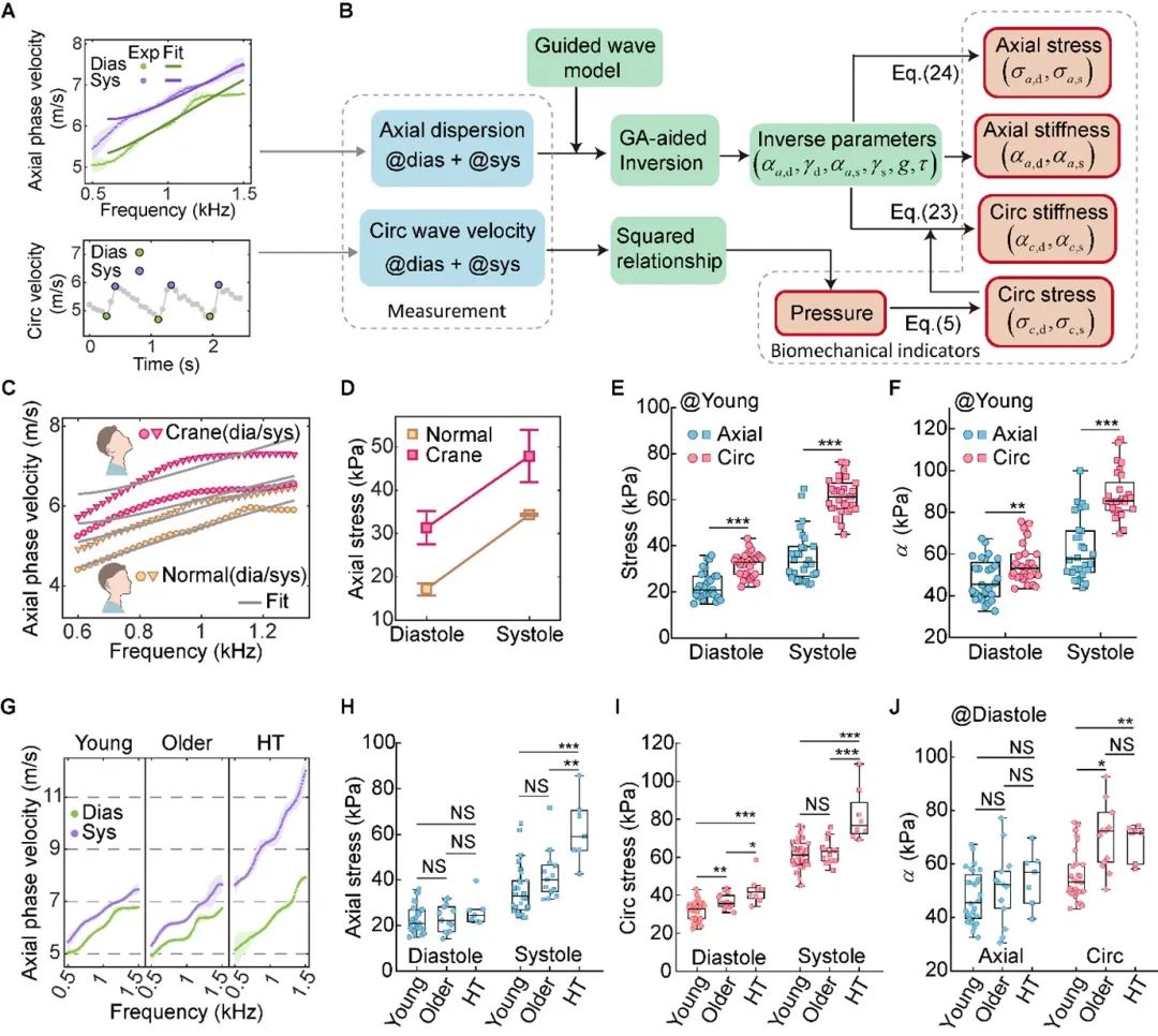 为进一步表征动脉的应力和刚度,研究团队提出了一个综合考虑动脉粘弹性、大变形、复杂几何及边界条件的波动力学模型,从理论上建立了动脉应力、刚度与导波频散特征的定量联系。基于此力学模型,团队开发了一种智能反演算法,能够从实验测得的导波频散和速度信息中,定量推断动脉的双向刚度和双向应力(图4A-B)。在颈部伸展的对比实验中,团队首次定量表征出动脉轴向应力随颈部拉伸增加了约13 kPa(图4C-D)。凭借毫秒级时间分辨率,本研究首次捕捉到心动周期中动脉各向异性演变的细节:环向应力与轴向应力的比值由舒张期的约1.7倍增加至收缩期的1.9倍;环向刚度与轴向刚度的比值则由1.2倍升至1.5倍(图4E-F)。研究团队还发现了一个此前从未被揭示的趋势:随着年龄增长和高血压状态的出现,环向应力和刚度显著升高,而轴向方向几乎保持“稳定”。这一差异化特征提示,血管可能通过复杂的组织重构策略,在老化和病变过程中优先维持轴向力学稳定,这为深入理解动脉在生理和病理过程中的进展提供了新的视角。
