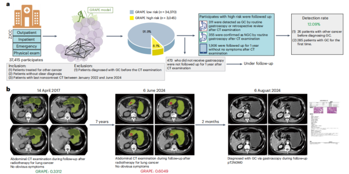 然而,在现代医疗体系中,一个未被充分开发的巨大数据金矿正静待发掘。每年,全球有数以亿计的非增强计算机断层扫描(CT)检查因各种临床原因被执行。这些海量、常规产生的医疗数据,长期以来被视为与胃癌筛查无关的“副产品”。一项发表于《自然·医学》(Nature Medicine)的题为“AI-based large-scale screening of gastric cancer from noncontrast CT imaging”(基于AI的CT平扫成像进行胃癌大规模筛查)的突破性研究,正试图将这些被忽视的数据转化为对抗胃癌的第一道防线。由浙江省肿瘤医院、阿里巴巴达摩院等机构的研究人员共同开发的深度学习模型——GRAPE(Gastric Cancer Risk Assessment Procedure with Artificial Intelligence),旨在通过分析常规的非增强CT影像,实现大规模、低成本的胃癌机会性筛查。这种“机会性筛查”的理念,代表了公共卫生策略的一次根本性转变:不再是耗费巨资组织健康人群进行专门的筛查项目,而是智能地利用每一次既有的临床诊疗行为和数据流,构建一张无形的、低成本的健康安全网。