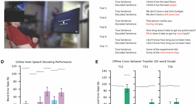 2. 成功实现实时的内部言语解码:研究团队成功开发并演示了一款可以实时解码内部言语的BCI系统(图3)。参与研究的严重构音障碍者能够仅通过默想句子,就将其从一个包含125,000个单词的大词汇库中解码出来,并转化为文本和语音。
