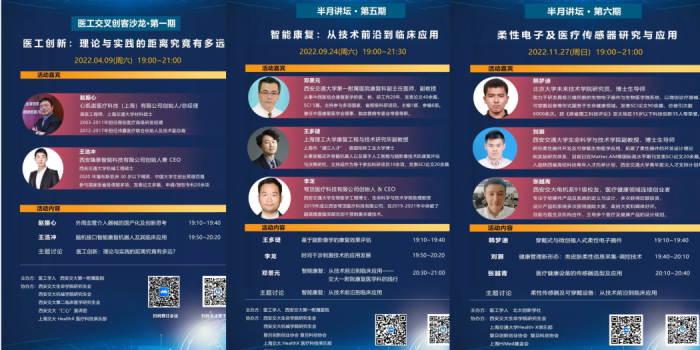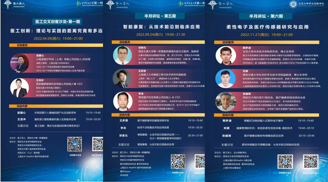 邀请医学、科研院所、企业、政府等不同背景专家学者分享讨论,促进医工交叉多元对话。迄今已针对医工结合创新、智能康复、柔性电子传感器等主题举办多场活动。