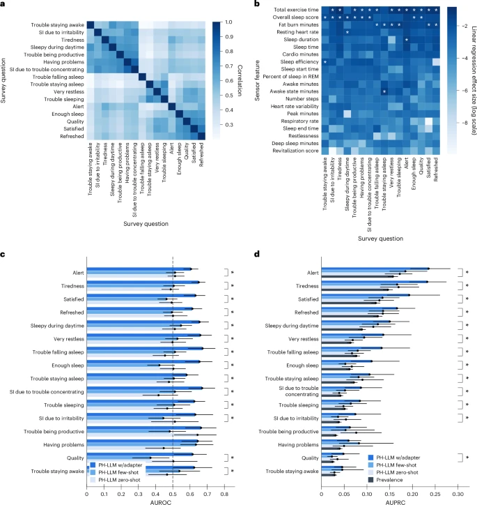 图3:PH-LLM使用传感器数据预测主观睡眠质量报告结果(PRO)的能力。