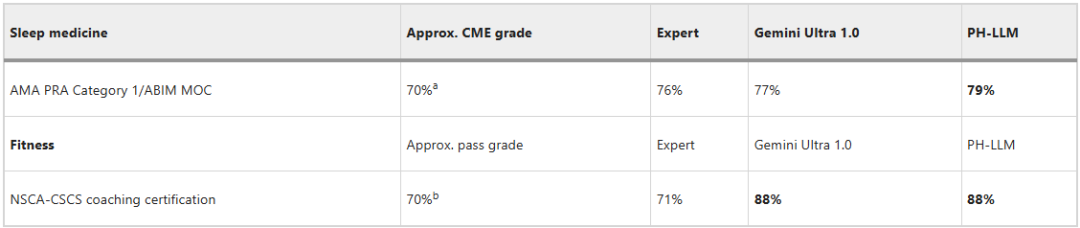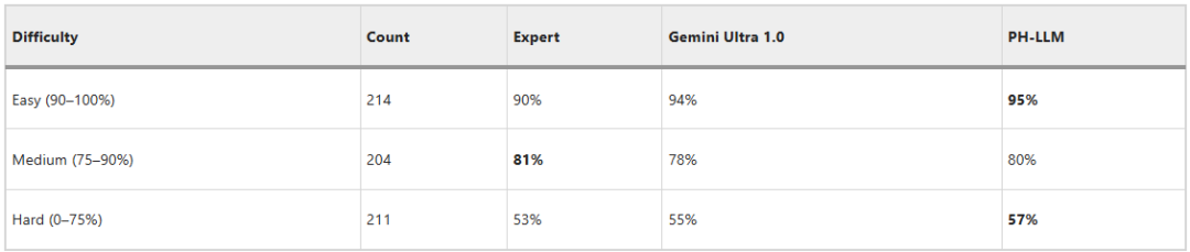表1:PH-LLM在模拟专业认证考试中的表现