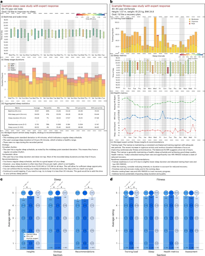 随着穿戴式设备的普及,人们能够持续监测睡眠、身体活动和心率等健康数据。然而,这些数据往往是零散、缺乏情境的,普通用户甚至临床医生都很难解读并从中获得个性化、可执行的健康建议。但现在,Google的研究人员给出了新的答案:一个专为您打造的AI健康教练。8月14日发表在《Nature Medicine》的文章中,Google研究中心团队开发了一款名为“个人健康大型语言模型”(PH-LLM)的AI。