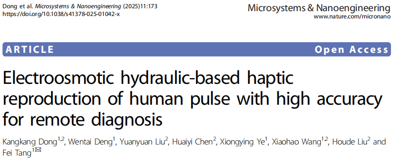 [1] Dong, K., Deng, W., Liu, Y. et al. Electroosmotic hydraulic-based haptic reproduction of human pulse with high accuracy for remote diagnosis. Microsystems & Nanoengineering 11, 173 (2025).