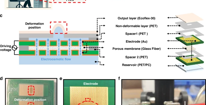 研究团队基于此原理,设计了一个厚度仅有3.5毫米的紧凑设备。其内部由微电极、多孔玻璃纤维和一种特殊的电渗流体构成。当系统接收到患者的真实脉搏信号后,会将其转换为变化的驱动电压。这个电压精准地“指挥”着设备内的液体流动,推动表面的柔性材料产生微小的起伏和压力变化——一个与源头几乎完全相同的“数字脉搏”就这样被实时创造了出来。