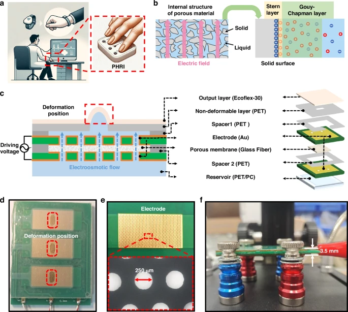 该团队的答案是一种全新的“电渗流液压”技术。在一个充满微小孔道的材料中,当施加一个微弱的电场时,液体中的离子便会像听从号令的士兵一样,开始定向移动,进而带动整个液体流动起来。这便是“电渗流”的魔力。它无需任何机械泵或阀门,就能产生精确可控的液压。