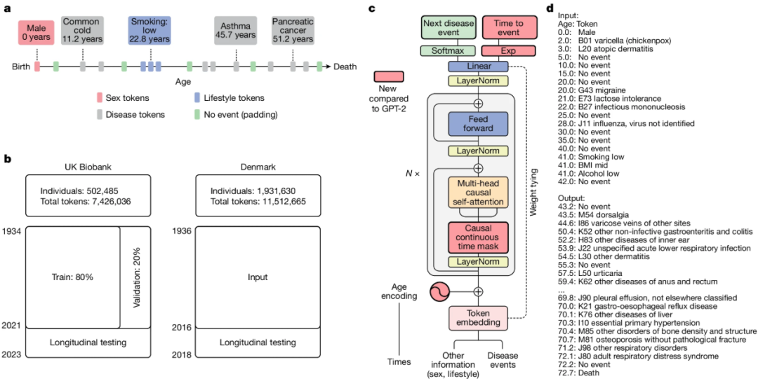 图1:Delphi-2M架构示意。a:基于ICD-10诊断、生活方式和健康填充标记的健康轨迹示意图,每个标记记录于特定年龄。b:源自两大公共数据集UK Biobank和Denmark的训练、验证和测试数据。c:Delphi模型架构。红色元素表示与基础GPT-2模型相比的改动。"N×"表示连续应用Transformer块N次。d:包含(年龄标记)对的模型输入(提示)和输出(样本)示例。