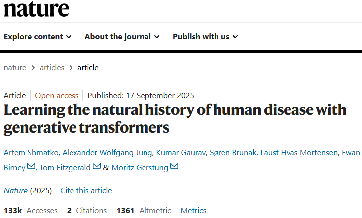 Shmatko, A., Jung, A.W., Gaurav, K. et al. Learning the natural history of human disease with generative transformers. Nature (2025). https://doi.org/10.1038/s41586-025-09529-3.
