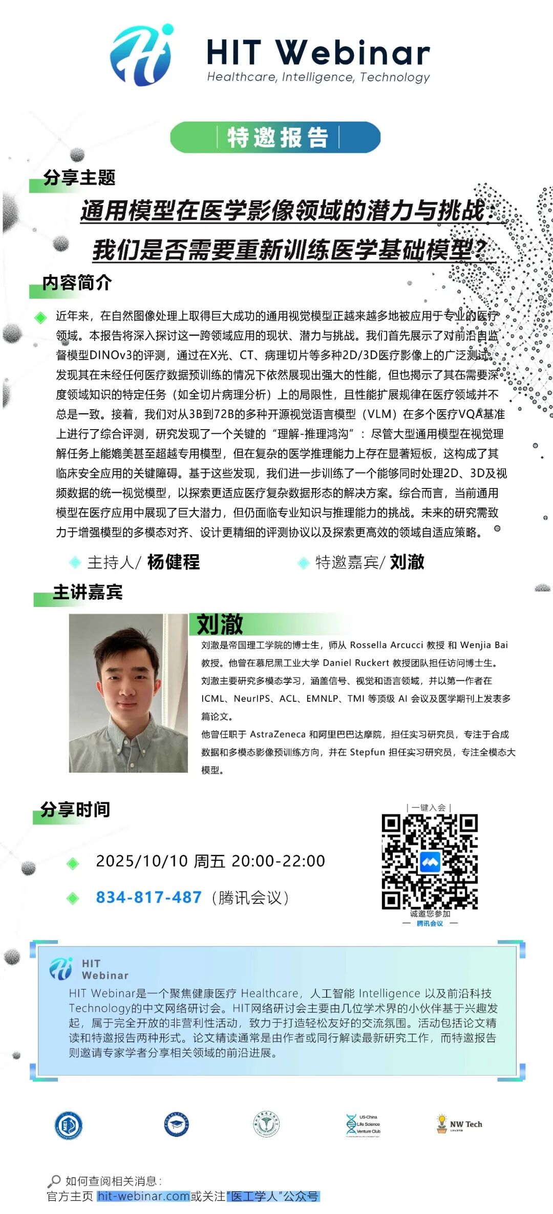 HIT Webinar 聚焦生物医疗,人工智能及前沿科技,围绕Healthcare,Intelligence & Technology探索医学影像处理、计算机视觉、智慧医疗、生物信息学、新型临床诊疗装备、智能康复机器人、医疗可穿戴设备、人工智能辅助制药等前沿技术的发展与应用。