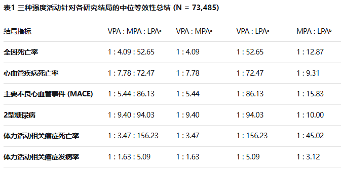 对于降低全因死亡风险:1分钟VPA约等于4.1分钟的MPA。