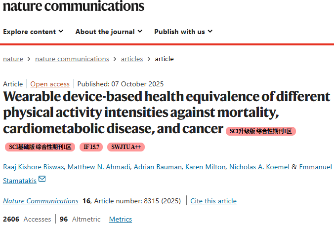 Biswas, R.K., Ahmadi, M.N., Bauman, A. et al. Wearable device-based health equivalence of different physical activity intensities against mortality, cardiometabolic disease, and cancer. Nat Commun 16, 8315 (2025). https://doi.org/10.1038/s41467-025-63475-2