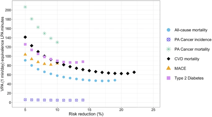 研究还首次精确量化了低强度活动(如散步)的价值。结果显示,虽然LPA有益,但效率极低。要达到1分钟VPA的健康效果,你需要进行长达53分钟(降低全因死亡风险)甚至94分钟(预防2型糖尿病)的低强度活动。并且,LPA能够带来的风险降低幅度上限也远低于中高强度活动。