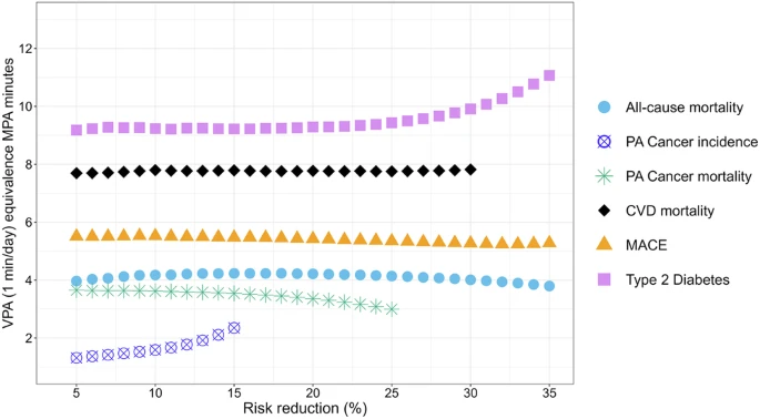 图1:针对全因死亡率、主要不良心血管事件(MACE)、心血管疾病死亡率、2型糖尿病、体力活动相关癌症死亡率及体力活动相关癌症发病率,在不同风险降低幅度下,中等强度体力活动时间与1分钟高强度体力活动的等效性。