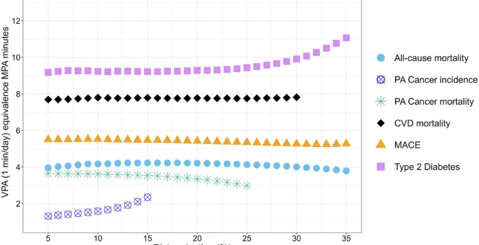 10月7日,一篇发表在《Nature Communications》上的重磅研究,利用来自超过7万人的可穿戴设备数据,对这一传统观念发起了颠覆性挑战。研究结果很有趣:在预防心血管疾病死亡方面,1分钟高强度运动(VPA)带来的对死亡率、癌症和心血管代谢等疾病的健康益处,实际上等同于近8分钟的中等强度运动(MPA)。