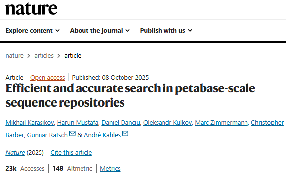 [1] Karasikov, M., Mustafa, H., Danciu, D. et al. Efficient and accurate search in petabase-scale sequence repositories. Nature (2025).