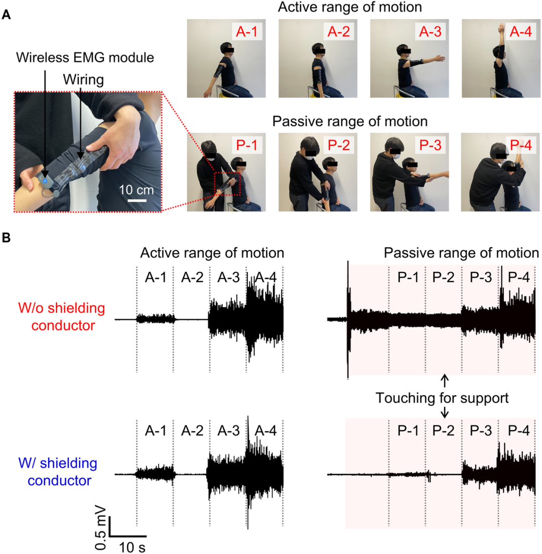 研究人员让测试者穿戴集成该纱线的臂带,监测肩部三角肌的活动。在“被动运动范围”(Passive Range of Motion)测试中,由另一人辅助移动测试者的手臂。此时,辅助者的身体接触会给传统传感器带来巨大的噪声。结果显示,无屏蔽的纱线所采集的信号几乎被噪声完全污染,无法分辨肌肉是否在活动。而采用同轴屏蔽纱线的系统,即使在直接的身体接触下,依然能清晰、准确地记录下三角肌随着手臂角度变化的细微电活动。这在物理治疗和康复监测领域具有巨大价值,治疗师可以在不干扰信号的情况下,辅助患者进行康复训练并获得精确的肌肉反馈。