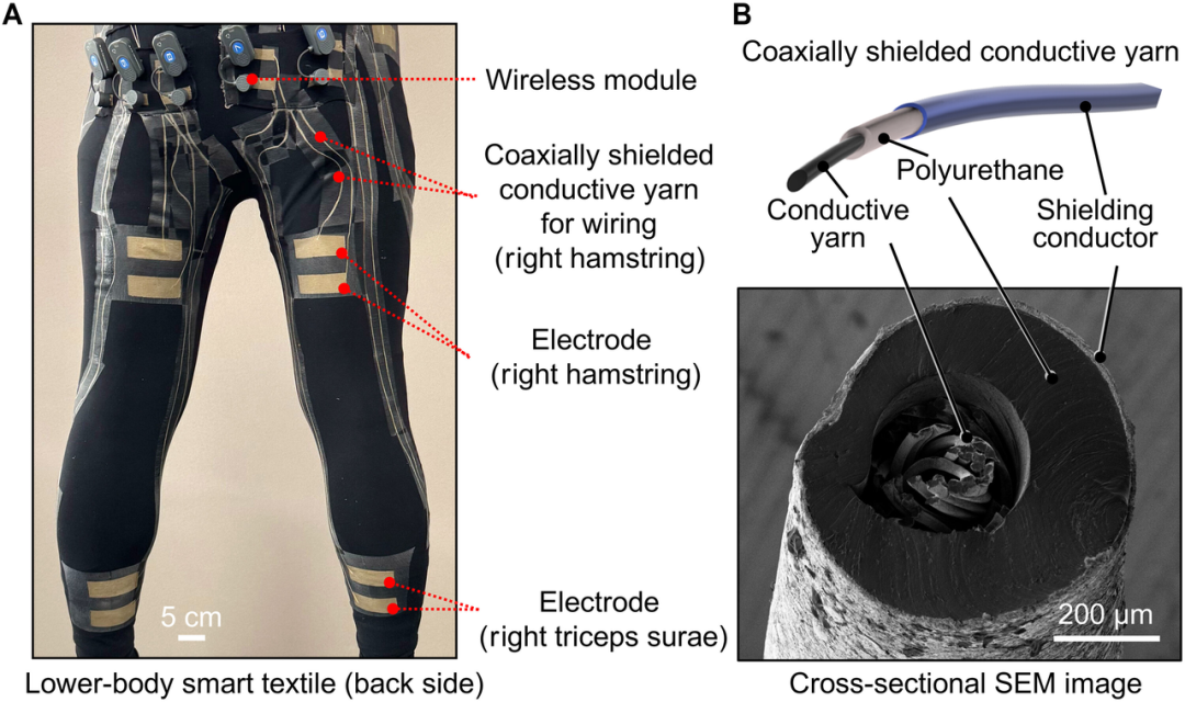 一项来自东京大学和理化学研究所(RIKEN)的新技术,10月15日在《科学进展》(Science Advances)上发表,为这个问题提供了一个优雅且极具潜力的工程解决方案:通过将高保真屏蔽电缆的原理微缩并融入可拉伸的纺织物中,开发了一种基于同轴屏蔽导电纱线的全身肌电监测系统。这项技术的核心,是将传统用于精密仪器的高保真屏蔽电缆,变成了一种可以像普通纱线一样编织、拉伸和穿着的“智能线”。 解决了长期困扰可穿戴生物传感器的“噪声”难题。这项创新可能将精确的人体机能分析,从实验室真正带入运动场、康复中心和我们的日常生活。
