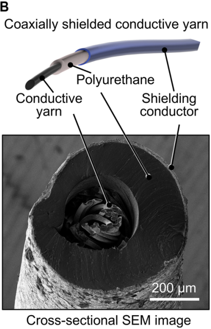 论文团队的解决方案是重新设计信号传输的载体——纱线本身。他们创造了一种微型的、可拉伸的同轴电缆结构。