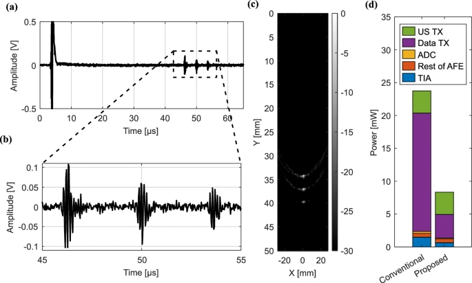 图2:系统性能。(a) 平面波发射的完整瞬态超声回波响应(通过对数增量ADC输出解码获得)。(b) 铜线反射信号的放大视图。(c) 使用平面波成像采集的B模式图像。(d) 功耗分解,对比传统实现方案与采用所提出技术的单通道功耗。