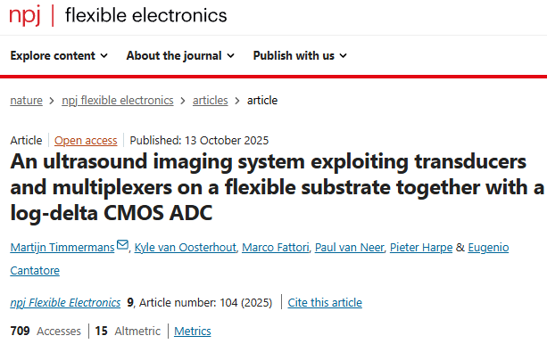 [1] Timmermans, M., van Oosterhout, K., Fattori, M. et al. An ultrasound imaging system exploiting transducers and multiplexers on a flexible substrate together with a log-delta CMOS ADC. npj Flex Electron 9, 104 (2025).