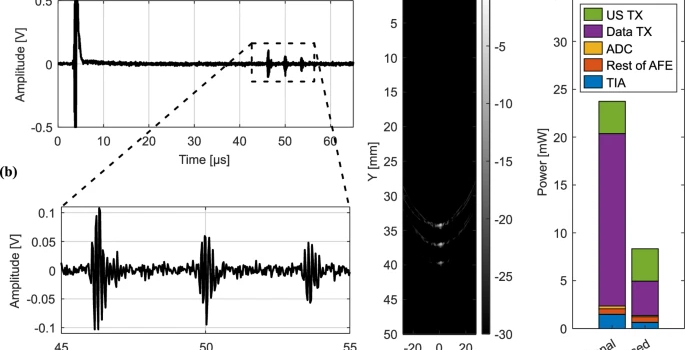 图2:系统性能。(a) 平面波发射的完整瞬态超声回波响应(通过对数增量ADC输出解码获得)。(b) 铜线反射信号的放大视图。(c) 使用平面波成像采集的B模式图像。(d) 功耗分解,对比传统实现方案与采用所提出技术的单通道功耗。