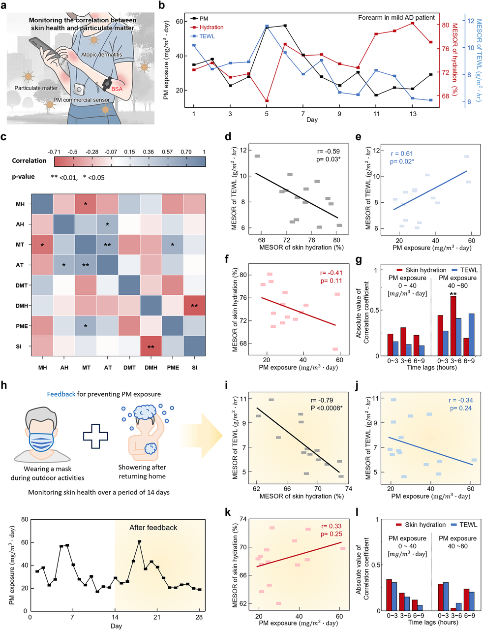 图2:BSA与PM传感器协同监测临床试验示意图 这是该研究最具影响力的部分。BSA的长期、高精度数据首次在个体层面揭示了环境与皮肤健康的直接联系。 客观诊断疾病: 在对特应性皮炎(AD)患者的测试中,BSA明确捕捉到了其受损皮肤屏障的典型特征——SH和TEWL之间存在显著的负相关性(r=-0.509, p<0.01),而健康对照组则没有这种相关性。这证明了BSA能客观评估皮肤屏障的健康状况。 量化污染危害: 这项研究的“点睛之笔”在于一项为期28天的临床试验。研究者让一名AD患者同时佩戴BSA和便携式PM颗粒物传感器(如上图a)。 🔹结果发现: 患者的TEWL(皮肤受损指标)与PM暴露量显著正相关(r=0.61, p=0.02)(如上图e)。这意味着,空气污染确实在实时加剧他的皮肤损伤。 🔹值得注意的是: 同期记录的传统临床主观评分(SCORAD指数)未能显示出这种相关性,这凸显了BSA客观、连续监测的巨大优越性。 验证干预效果: 在研究的后14天,患者采取了干预措施(如戴口罩、回家后淋浴)。惊人的是,BSA的数据显示,PM暴露与TEWL之间的相关性消失了(如上图j)。这首次在个体层面定量证实了个人防护措施对抵抗环境污染、保护皮肤屏障是确实有效的。