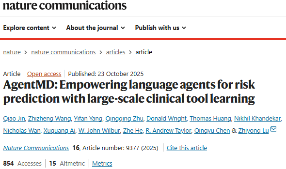 [1]Jin, Q., Wang, Z., Yang, Y. et al. AgentMD: Empowering language agents for risk prediction with large-scale clinical tool learning. Nat Commun 16, 9377 (2025). https://doi.org/10.1038/s41467-025-64430-x END 编辑 | 郝娅婷 排版 | 张艳青 审核 | 医工学人理事会
