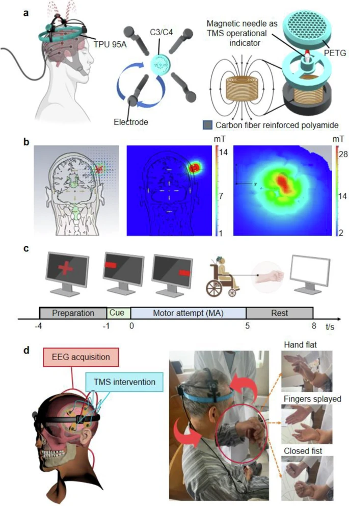 图1:用于增强运动功能恢复评估的自适应EEG-TMS集成系统。a,传统EEG采集方法与TMS干预是相互分离的独立系统。b,临床闭环EEG-TMS监测与调控系统。该系统展示了通过实时反馈环路,将EEG信号与TMS结合以增强运动功能调节。c,本研究中提出的便携式EEG-TMS系统:磁神经环(Magnetic NeuroRing)由一个可穿戴环组成,能以500 Hz采集EEG数据,并可通过蓝牙连接实现无线数据传输,从而促进脑卒中后康复的自适应和用户友好应用。 它如何工作? 实时感知:通过8个置于运动相关皮层(如FC3, FC4)的电极,以500Hz频率采集EEG信号,实时计算与运动意图相关的关键生物标记——事件相关去同步化(ERD)。 智能决策:系统设定一个简单的触发规则:当连续5次运动尝试中,ERD/ERS值均低于0(表明大脑运动皮层激活不足或抑制过度),即判定需要干预。 精准干预:决策触发后,系统自动对过度活跃的健侧大脑半球施加连续θ脉冲刺激(cTBS)。这是一种抑制性TMS模式,旨在降低健侧半球的过度兴奋,从而解除其对患侧半球的抑制,重塑卒中后受损的半球间平衡。 便携实现:设备采用3D扫描定制轻量化头戴装置(TPU 95A与碳纤维增强聚酰胺复合材料),并集成了悬浮磁线圈。该线圈能在表面产生约36mT的磁场,穿透至皮层仍保有约7mT强度,足以调节神经活动。 图2:用于运动康复的磁神经环系统概览。a,磁神经环结构示意图:外层采用TPU 95A柔性热塑性聚氨酯确保耐用性,并采用碳纤维增强聚酰胺提供结构支撑与刚性。位于这两层之间的是磁性针和磁环,用于在设备运行期间产生听觉提示。b,磁刺激模块设计与磁场强度测量。c,EEG采集期间的实验任务阶段示意图,包含准备、提示、运动尝试与休息阶段,以结构化管理康复流程。d,预期患者康复效果示意图,展示了三种手部姿势的完成:手掌平展、手指张开、握拳平放。