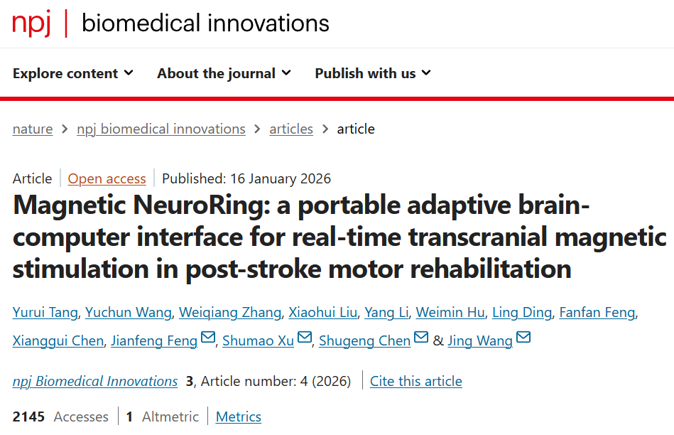 2026年1月16日,复旦大学联合研究团队研发出全球首款集诊断与治疗于一体的便携式、闭环脑机接口(BCI)设备——Magnetic NeuroRing。它通过实时脑电图(EEG)监测患者运动意图,自动触发并调整经颅磁刺激(TMS)参数,首次将精准的神经调控从笨重的临床设备中解放出来,为实现个性化、数据驱动的居家脑卒中康复提供了开创性的技术范式。
