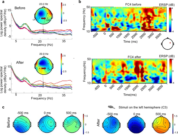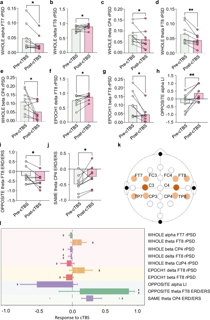 研究通过健康受试者(n=9)和初步的卒中病例,验证了系统的可行性与神经调控效果。 神经生理验证:在健康受试者中,施加于一侧半球的cTBS成功引起了跨半球的频谱功率变化。例如,刺激健侧半球后,非刺激半球的θ波功率在特定通道(FT8)显著增加,而δ波功率下降。这证实了cTBS不仅能抑制目标脑区,还能在对侧引发代偿性的去抑制效应,符合“半球间竞争模型”。 任务态响应:在执行手部抓握任务时,系统观测到不对称的皮层重组。例如,在同侧手运动时,对侧运动皮层的θ波ERD减少,显示了经过cTBS干预后,跨胼胝体抑制的增强。 临床初步效果:在一个小规模的对照中,使用NeuroRing干预两周的实验组,其上肢Fugl-Meyer评分平均提升了“+7.0分”,显著优于仅接受常规治疗(+3.0分)的对照组。 可用性与安全性:来自临床医生和受试者的反馈显示,该设备在安全性(4.7/5)、可用性(4.5/5)和感知有效性(4.6/5) 方面均获得高评分。 图3:连续θ脉冲刺激干预对健康个体与患者EEG活动的影响。a,干预前后EEG信号的频谱图,显示干预后在α-β频段频谱功率增加。b,FC4电极位置干预前后的事件相关频谱扰动图,显示干预后低频段有明显的激活增强。c,干预前后的地形图,可见干预后激活明显增加(蓝色区域)。图中显示了-500 ms和500 ms的时间点,以考虑参与者任务相关的变异性。 图4:cTBS对静息与任务状态下EEG影响的综合分析。a-g,静息态记录中cTBS干预前后各种EEG特征的功率谱密度变化(*p < 0.05, p < 0.01)。a,FT7电极位置的全频段α波PSD显著增加。b,FT8电极位置的全频段δ波PSD升高。c,CP4电极位置的全频段θ波PSD显著增加。d,FT8电极位置的全频段θ波PSD显著增加。e,CP4电极位置的全频段β波PSD增加。f,时段1中FT8电极位置的δ波PSD显著增强。g,时段1中FT8电极位置的β波PSD增加。h,左侧半球cTBS诱发偏侧化指数由负转正,表明半球间优势逆转。i,右手运动期间,右侧运动皮层ERD增加,反映了因左侧半球输出受抑制而出现的去抑制效应。j,左手运动期间,右侧运动皮层ERD降低,表明来自被抑制左侧半球的经胼胝体抑制增强。k,用于数据采集的EEG通道标示,橙色标记的八个通道用于特征提取,深棕色通道表示施加cTBS的具体位置。l,cTBS干预后所有分析的EEG特征的显著性变化概览,提供了调控效应的整体情况,并支持了当前干预方案的可行性与神经生理相关性。