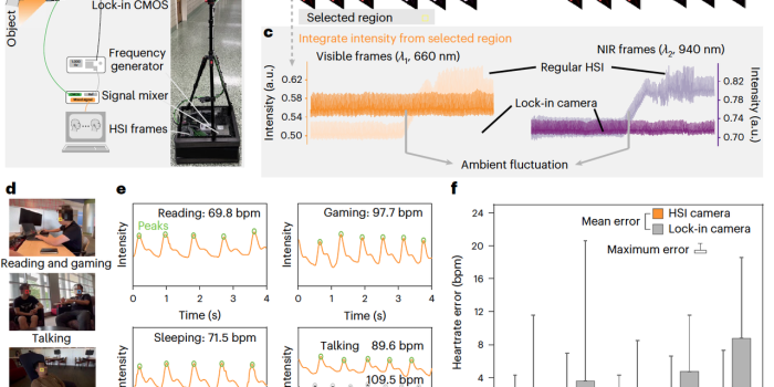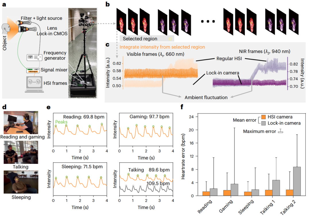 远程生物识别传感(如非接触式心率监测)在远程医疗和个人健康管理中具有巨大潜力。然而,现有的高光谱成像(HSI)技术在面对环境光波动时显得十分脆弱,难以走出实验室进入现实生活。近期,美国威斯康星大学麦迪逊分校(University of Wisconsin-Madison)的研究团队在 Nature Sensors 上发表了题为 “Robust spectral sensor for standoff biometric detection” 的研究论文。该研究开发了一种基于锁相相机(Lock-in Camera)的高光谱成像框架,通过将特定波长的照明进行高频调制,并与相机的检测进行同步,成功在复杂多变的环境光下实现了高鲁棒性的生理信号监测,为远程健康评估的实际应用铺平了道路。