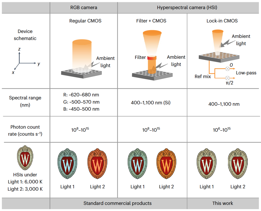 这项研究的核心在于通过硬件层面的创新,从根本上解决了传统光学传感器无法区分“有用信号”和“环境噪声”的难题。 1.锁相成像:给光信号加上“身份证” 研究团队设计了一套独特的成像系统。他们使用可编程的多波长LED阵列(覆盖350-1100nm)作为光源,并对每个波长的光进行特定频率的调制(例如1000Hz)。 -同步解调: 配合定制的锁相CMOS传感器,相机只“识别”并放大那些带有特定调制频率的光信号,而将不闪烁或频率不匹配的环境光(如阳光、室内灯光)统统视为噪声并加以滤除。 -极致抗扰: 实验表明,即使环境光强度波动剧烈,或者在极低光照(如月光下,1 µW/cm²)条件下,该系统仍能稳定捕捉到清晰的脉搏波信号。相比之下,传统HSI相机在这些场景下的信号往往被噪声淹没。 锁相高光谱成像系统的工作原理与传统技术的对比