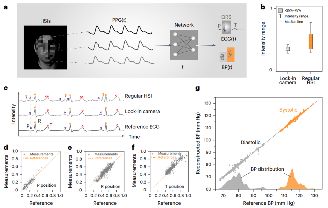 3. 深层信息的挖掘与重建 得益于极高的信噪比(SNR),该系统获取的光电容积脉搏波(PPG)信号保留了丰富的细节特征。 – 波形重建: 结合机器学习模型,研究人员成功利用面部PPG信号重建出了高保真的心电图(ECG)波形和血压(BP)数值。 – 临床潜力: 重建的ECG波形清晰地展示了P波、R波和T波等关键特征,与标准ECG设备的波形相关系数高达 0.941。这意味着未来仅通过“看”脸,就有可能进行心血管疾病的初步筛查。 基于高质量PPG信号的ECG波形与血压重建