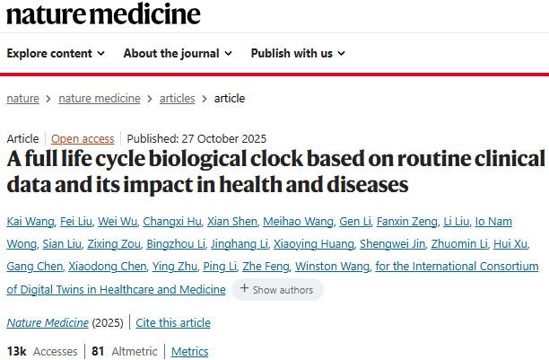 [1] Wang, K., Liu, F., Wu, W. et al. A full life cycle biological clock based on routine clinical data and its impact in health and diseases. Nat Med (2025). https://doi.org/10.1038/s41591-025-04006-w END 编辑 | 郝娅婷 排版 | 张艳青 审核 | 医工学人理事会